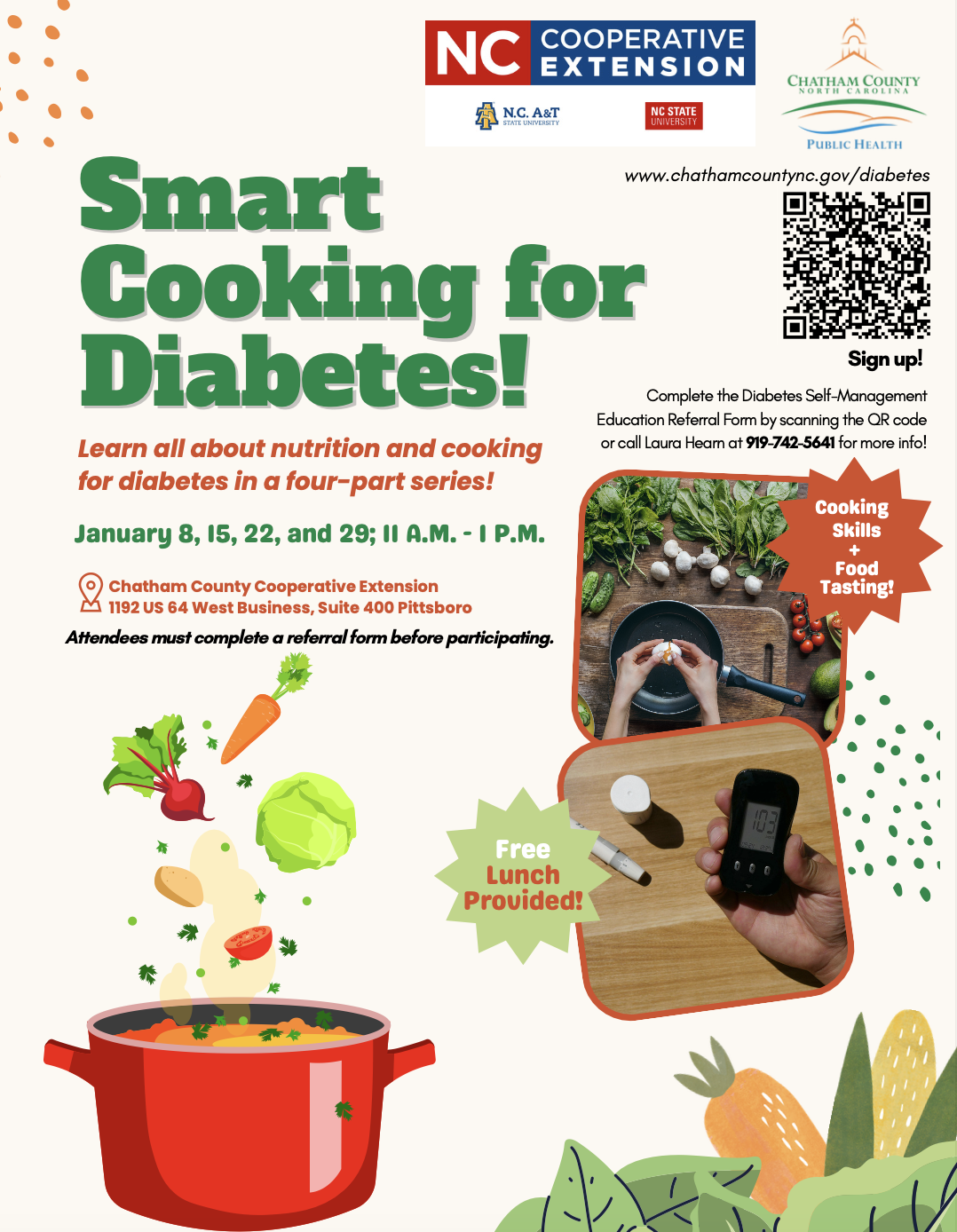 This program is offered in partnership with the Chatham County Public Health Department and led by Registered Dietitians Laura Hearn and Tara Gregory. In addition to practical cooking guidance and nutrition tips, participants will also learn about other important aspects of diabetes self-management, such as monitoring, stress management, and physical activity.